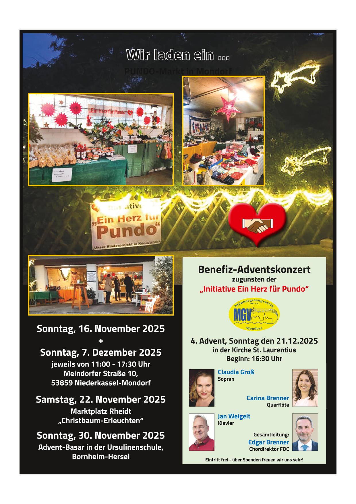 Die Pundoinitiative lädt zur ihren Pundomärkten ein und empfiehlt den Besuch des Adventskonzertes des MGVs Mondorf: